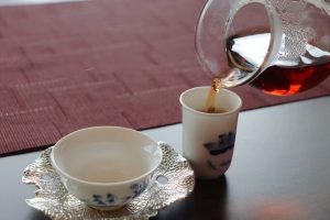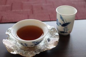 今回は2006年モウ海産の古樹プーアル熟茶を使用しました。茶葉は、茶色と黒色が混ざっていて、茶水は、濃い赤~黒に近い色、香りは、樟(くすのき)と連想される香り、陳香が分かりやすい。口当たりがまろやかで、プーアル茶が苦手だと思わる方でも受け入れられるハイクオリティのプーアル茶です。ちょうどその日は雨で冷えていましたが、飲んでいるうちに身体がぽかぽかになりました。