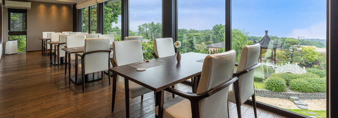 ガラス張りから目の前は紹興園、紹興園から伊豆の海が一望。